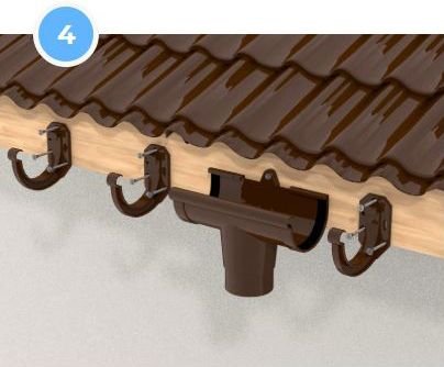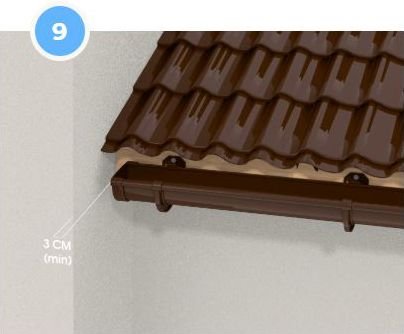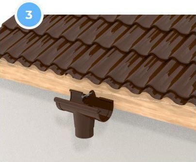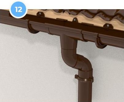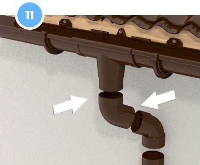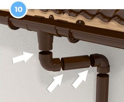 При невеликому виносі даху щодо стіни використовують муфту труби або комбінацію одномуфтового і двухмуфтового відводів. Стрілка на муфтах і відводах вказує напрямок потоку води, і завжди спрямована вниз. Рекомендована фіксація (див. крок 10).