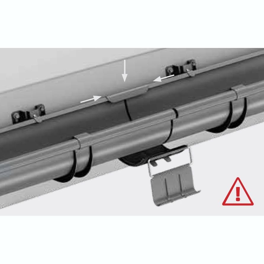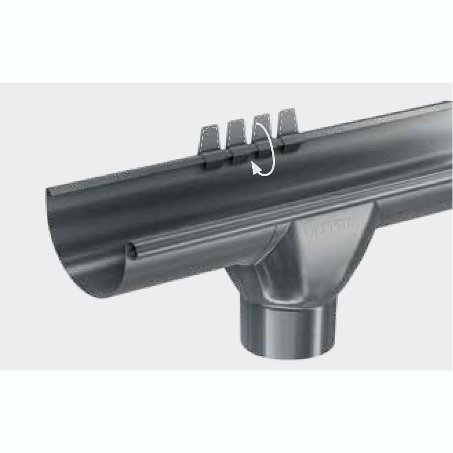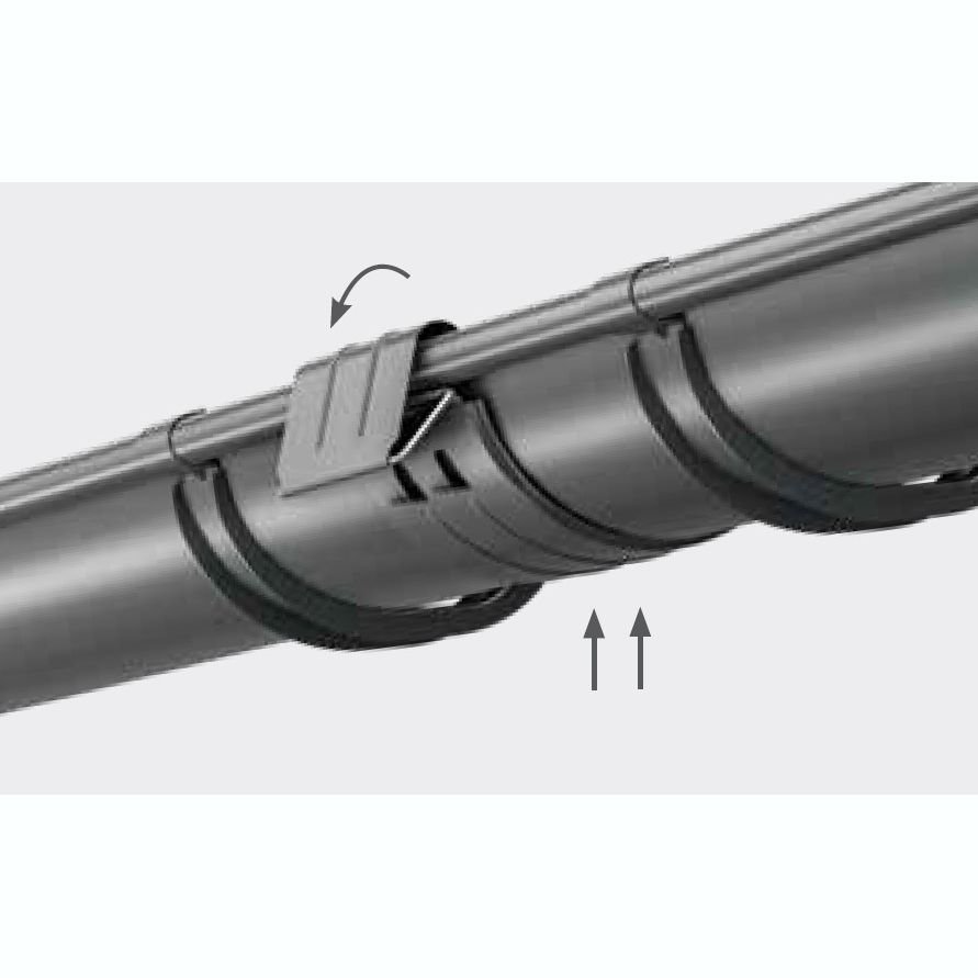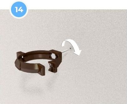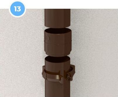Після встановлення задньої частини хомута, вставте передню частину в паз і закрутіть її. Хомути для водостічної труби слід встановлювати не рідше, ніж через кожні 2 м. При цьому обов’язково треба врахувати встановлення хо- мутів на муфті труби, колінах та зливах.