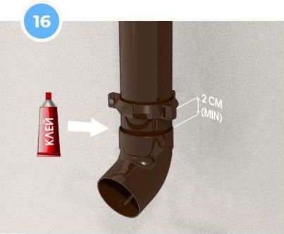 Нижній відвід фіксується до труби (див.крок 10). Для склеювання використовується тільки клей для ПВХ. Труба фіксується кронштейном. Відстань до відводу 2 см, до рівня землі не менше 20.
