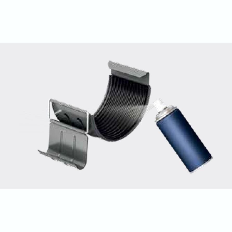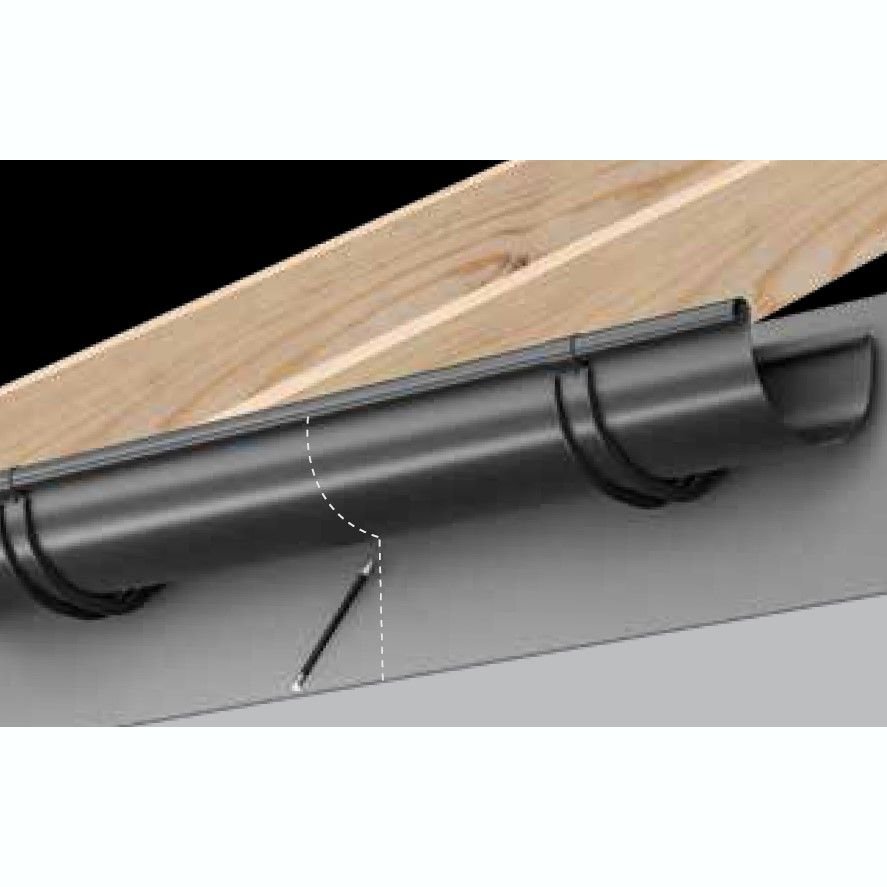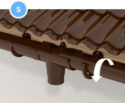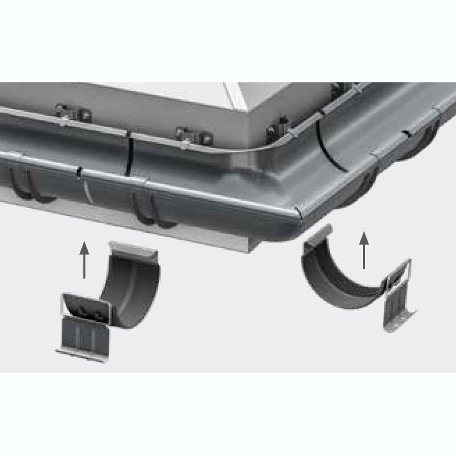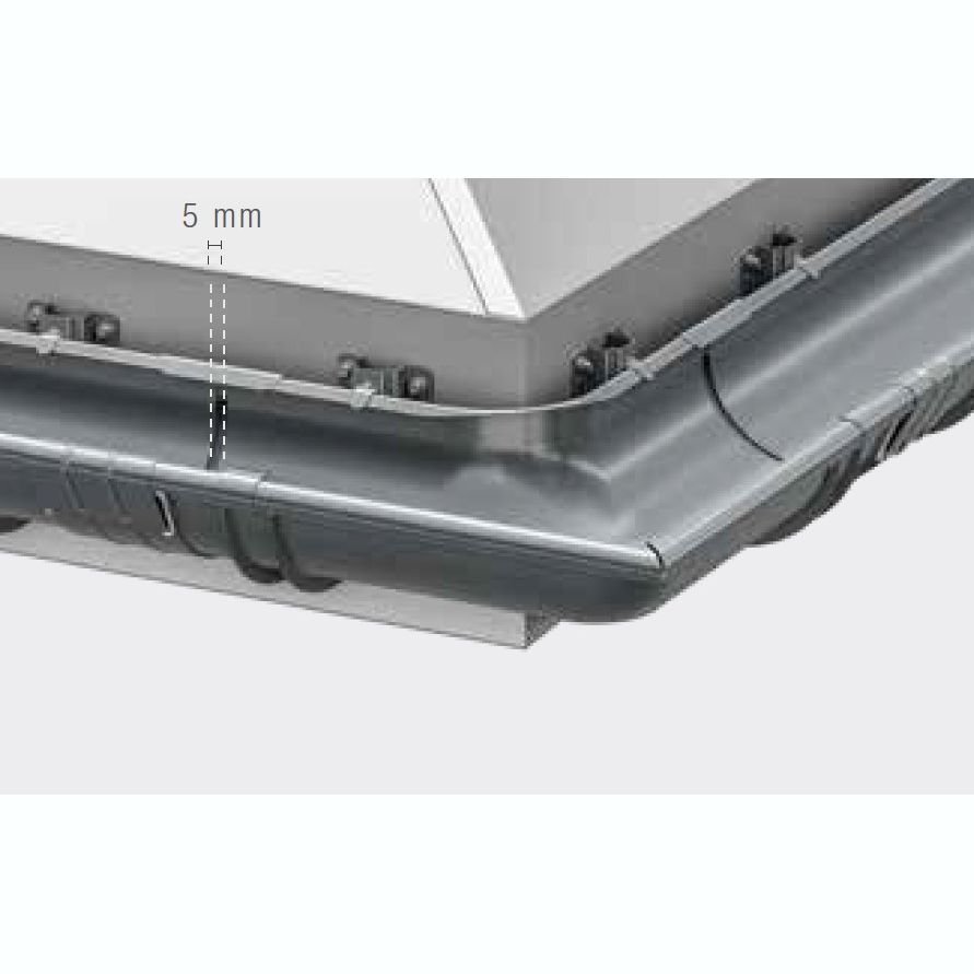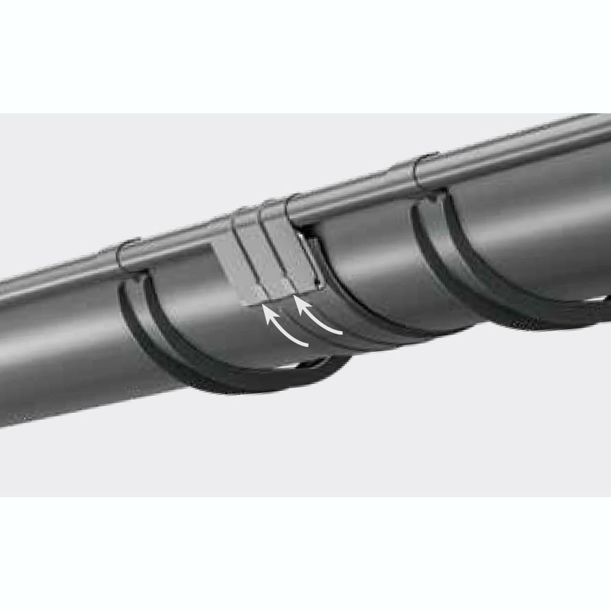 Кути з’єднуються з ринвами за допомогою муфт ринви. Для стабілізації системи необхідно використовувати додаткові кронштейни ринви. Щоб забезпечити належне розширення системи, ми залишаємо 5 мм зазору при з’єднанні кута з ринвою. Встановлюємо додаткові тримачі ринви на відстані максимум 15 см від центру муфти ринви.