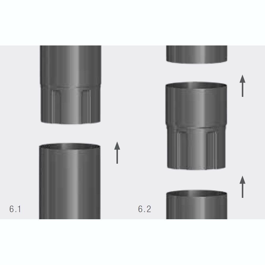 Водостічні труби мають муфтове закінчення (мал. 6.1). У випадку труби з відрізаним краєм, використовуємо муфту труби (мал. 6.2).