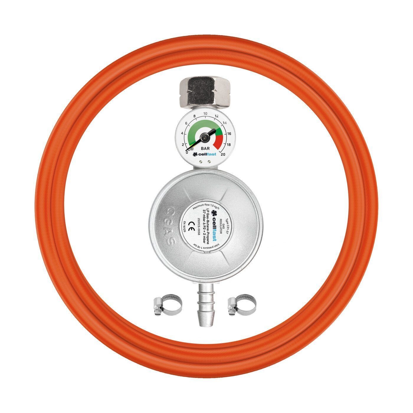 Комплект призначений для підключення газових приладів до балона. До складу входить редуктор з манометром та шланг довжиною 2 метри, що забезпечує зручність підключення та контроль тиску.