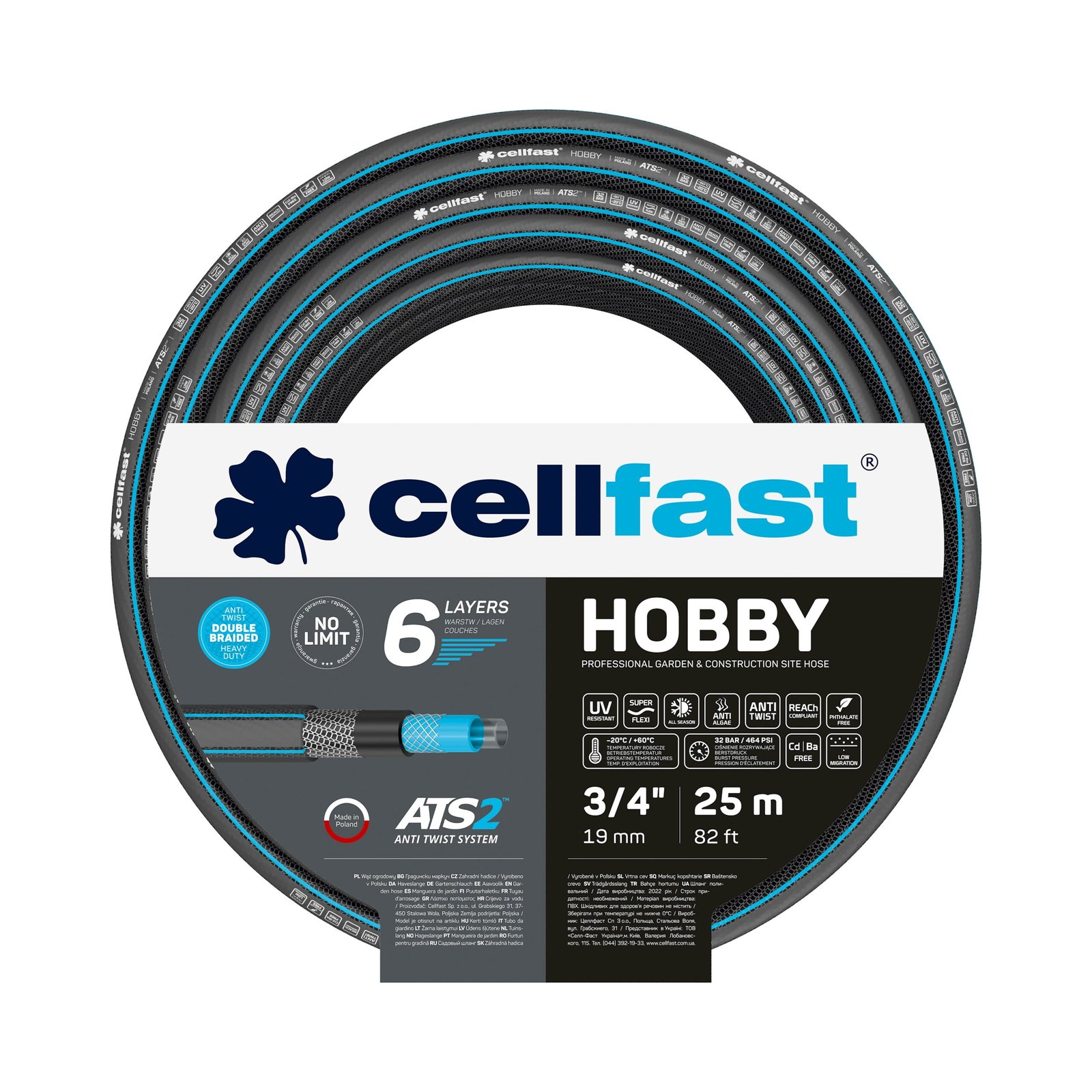 Садовий поливальний шланг Cellfast HOBBY призначений для подачі води під тиском для поливу саду, городу, газонів та інших господарських потреб. Підходить для транспортування води, у тому числі харчових рідин, відповідно до вимог Регламенту (EU) №10/2011.